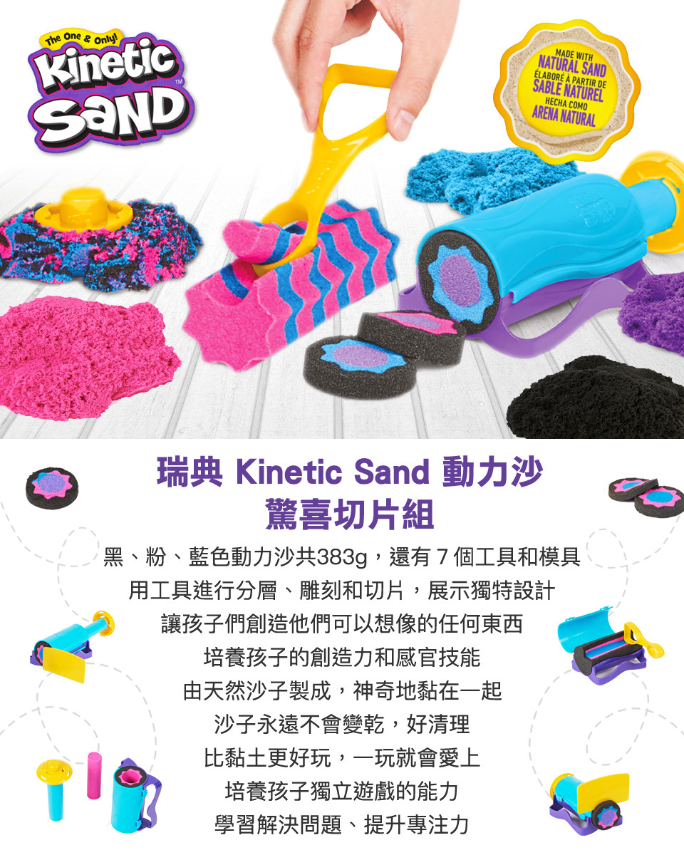黑、粉、藍色動力沙共383g,還有7個工具和模具。用工具進行分層、雕刻和切片,展示獨特設計,讓孩子們創造他們可以想像的任何東西,培養孩子的創造力和感官技能。由天然沙子製成,神奇地黏在一起,沙子永遠不會變乾,好清理。比黏土更好玩,一玩就會愛上。培養孩子獨立遊戲的能力,學習解決問題、提升專注力。
