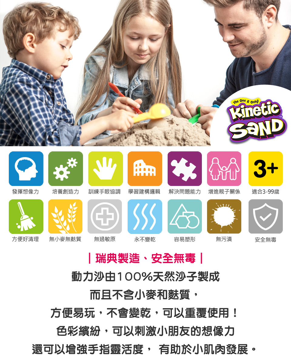 神奇的 Kinetic Sand 動力沙~100%安全無毒,通過台灣及歐美國家安全玩具認證。好清理、柔軟、延展性佳、易塑形,一玩就上癮,千變萬化任你玩,讓愛玩沙的小孩,安全的在家享受玩沙的樂趣!