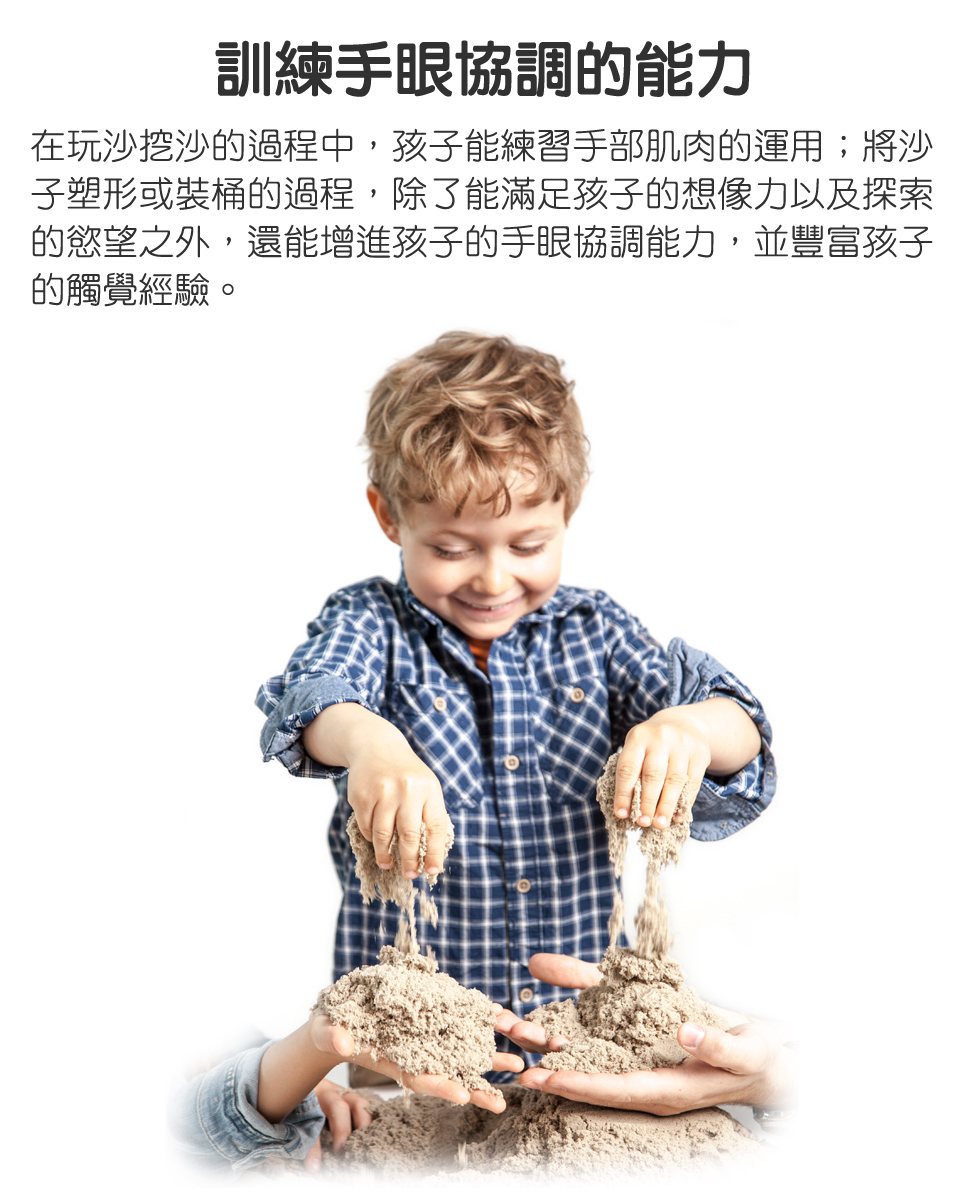 在玩沙挖沙的過程中,孩子能練習手部肌肉的運用;將沙子塑形或裝桶的過程,除了能滿足孩子的想像力以及探索的慾望之外,還能增進孩子的手眼協調能力,並豐富孩子的觸覺經驗。