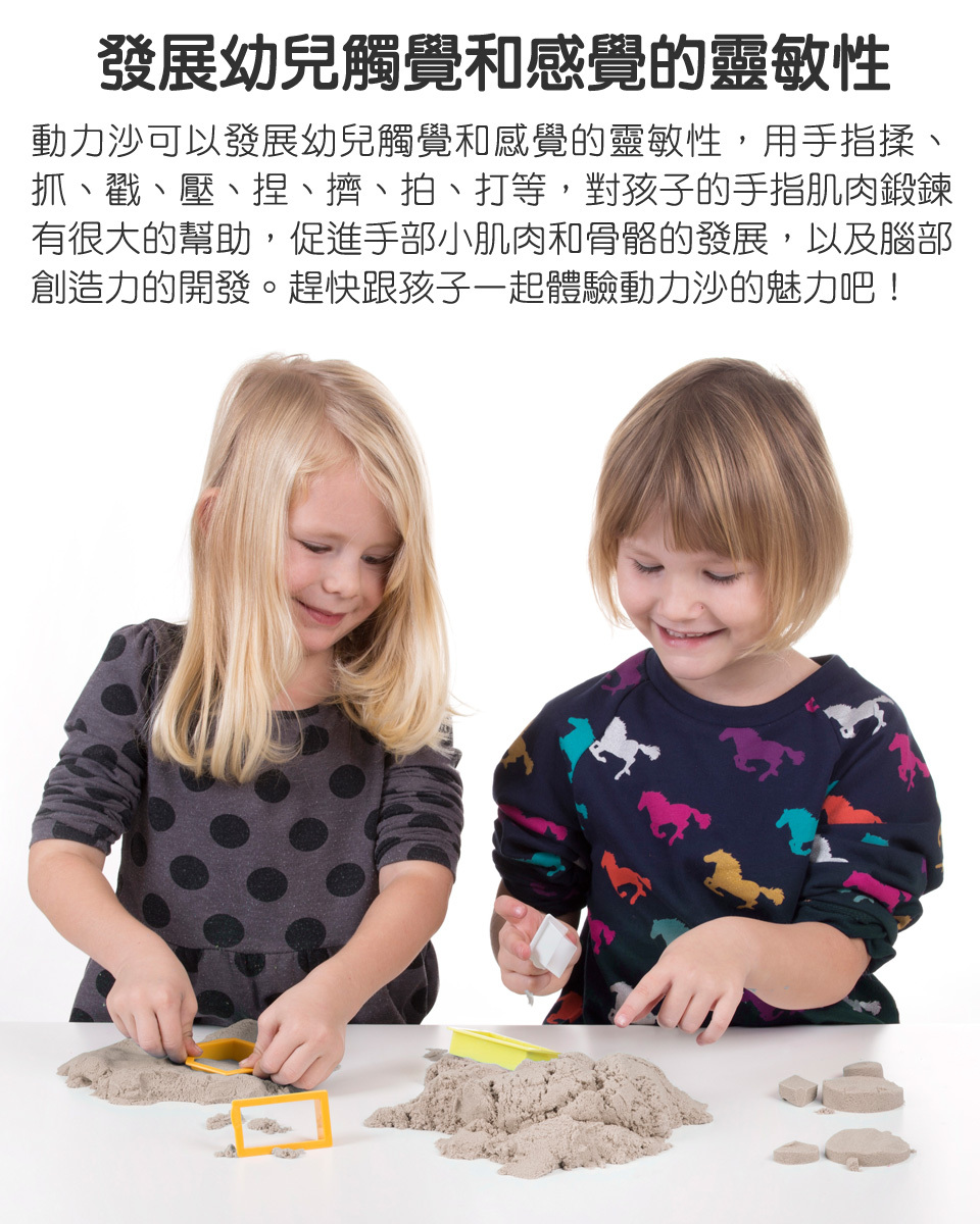 動力沙可以發展幼兒觸覺和感覺的靈敏性,用手指揉、抓、戳、壓、捏、擠、拍、打等,對孩子的手指肌肉鍛鍊有很大的幫助,促進手部小肌肉和骨骼的發展,以及腦部創造力的開發。趕快跟孩子一起體驗動力沙的魅力吧!