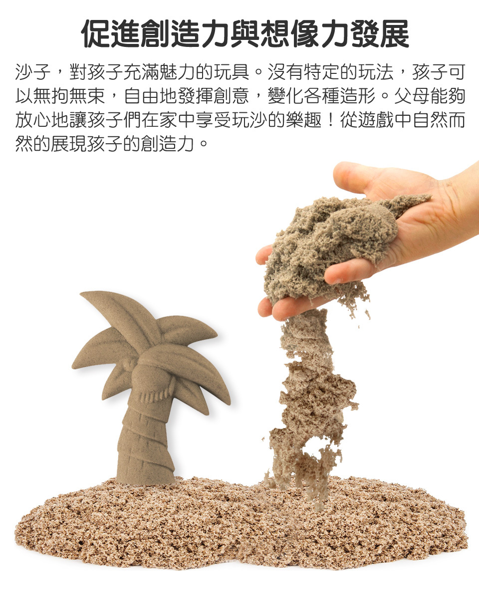 沙子,對孩子充滿魅力的玩具。沒有特定的玩法,孩子可以無拘無束,自由地發揮創意,變化各種造型。父母能夠放心地讓孩子們在家中享受玩沙的樂趣!從遊戲中自然而然的展現孩子的創造力。