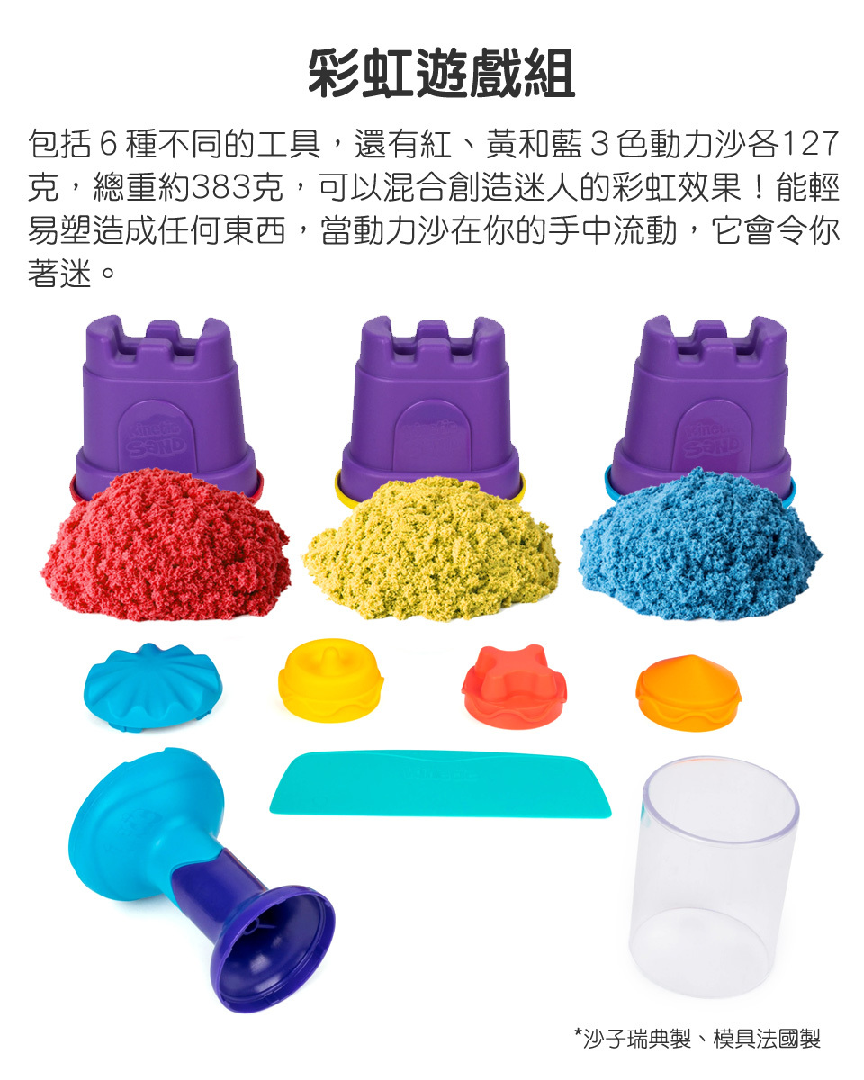 包括6種不同的工具,還有紅、黃和藍3色動力沙各127克,總重約383克,可以混合創造迷人的彩虹效果!能輕易塑造成任何東西,當動力沙在你的手中流動,它會令你著迷。