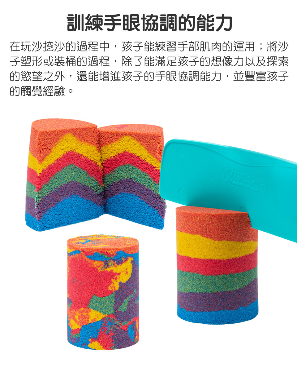 在玩沙挖沙的過程中,孩子能練習手部肌肉的運用;將沙子塑形或裝桶的過程,除了能滿足孩子的想像力以及探索的慾望之外,還能增進孩子的手眼協調能力,並豐富孩子的觸覺經驗。