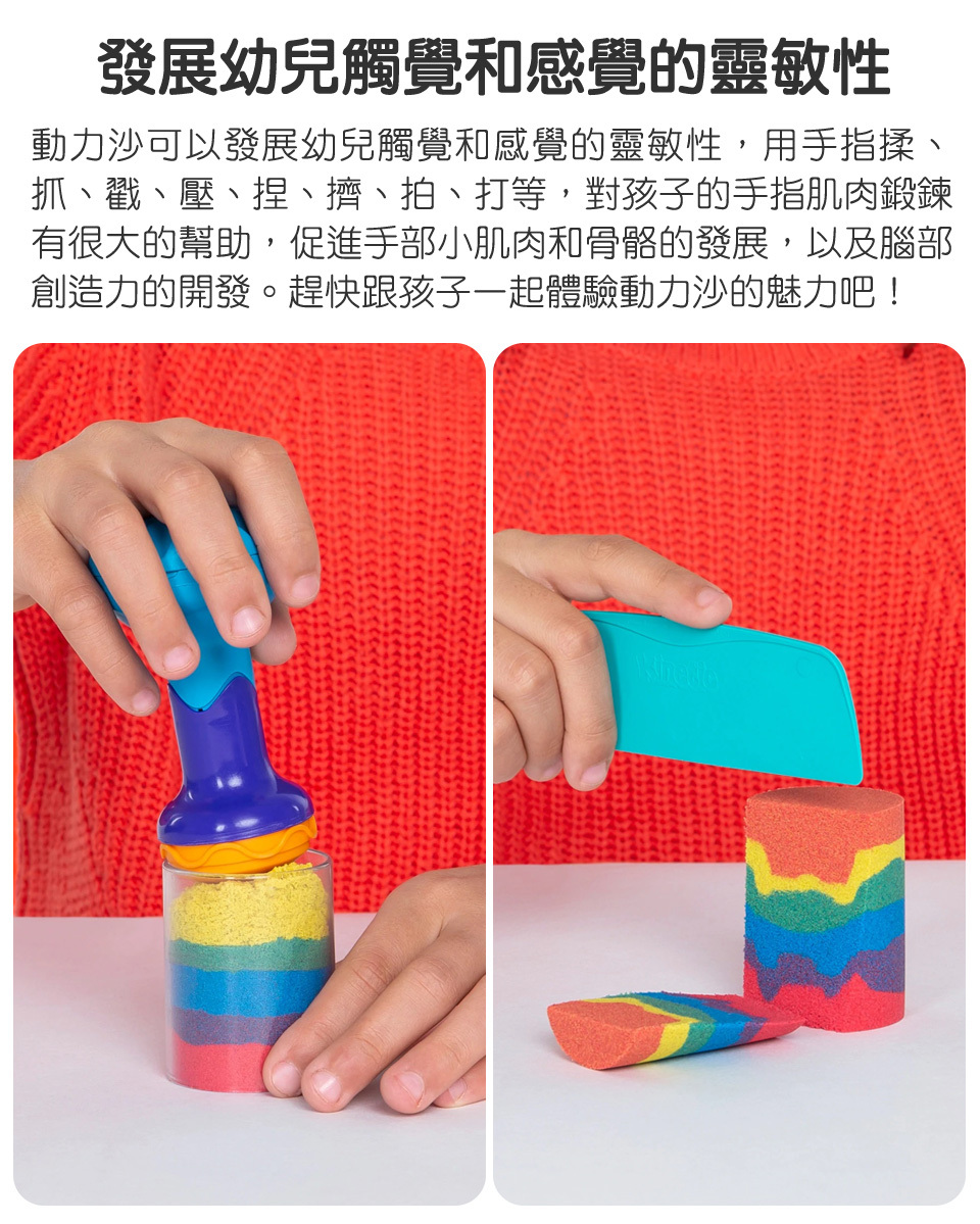 動力沙可以發展幼兒觸覺和感覺的靈敏性,用手指揉、抓、戳、壓、捏、擠、拍、打等,對孩子的手指肌肉鍛鍊有很大的幫助,促進手部小肌肉和骨骼的發展,以及腦部創造力的開發。趕快跟孩子一起體驗動力沙的魅力吧!